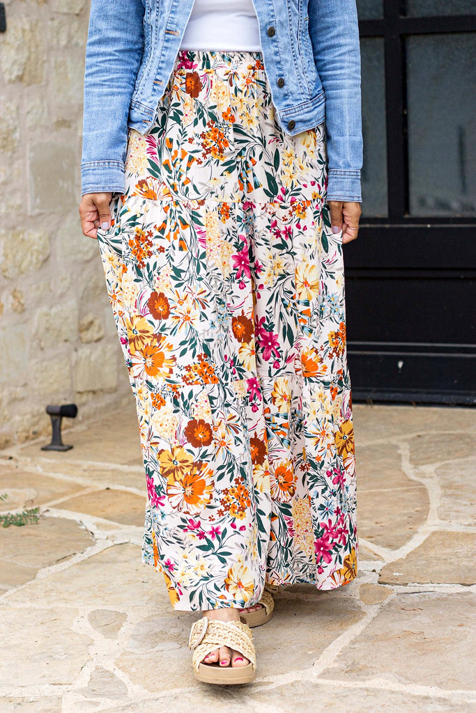 Our Marissa Skirt is a pretty and comfy skirt for spring, summer and fall! The color, the fit, the style are all absolute perfection! Pair with a white tee, a striped tee, a gray tee, pull one of the colors out of the floral print, pair with a jean jacket, a graphic tee, wedges, boots, so many options! This is one of our favorite brands and styles-in a new print!