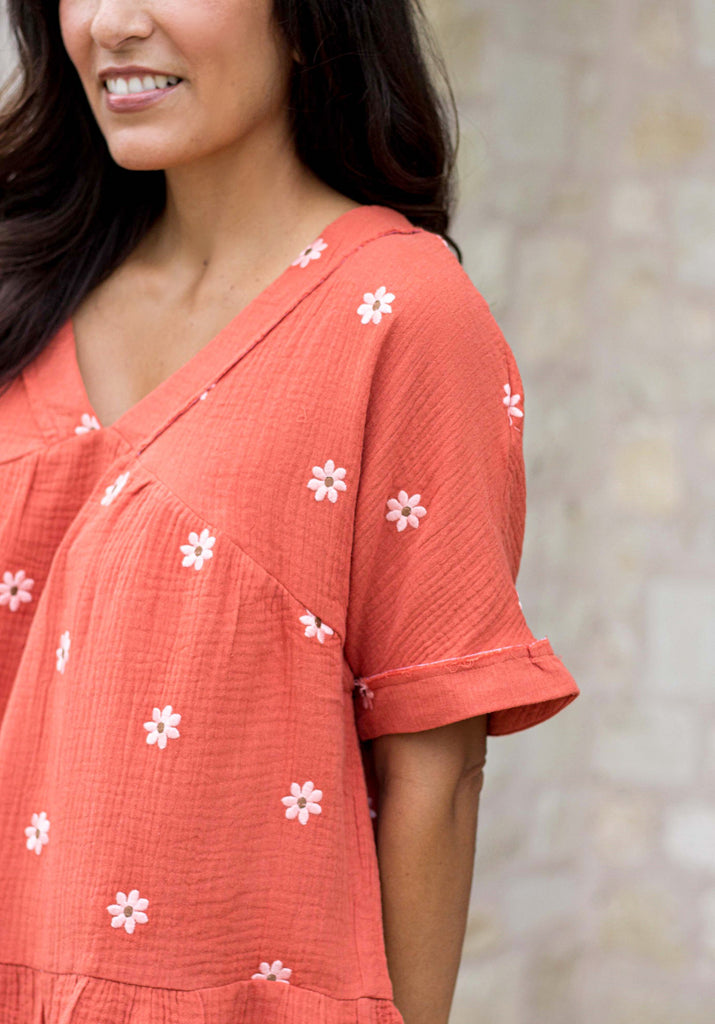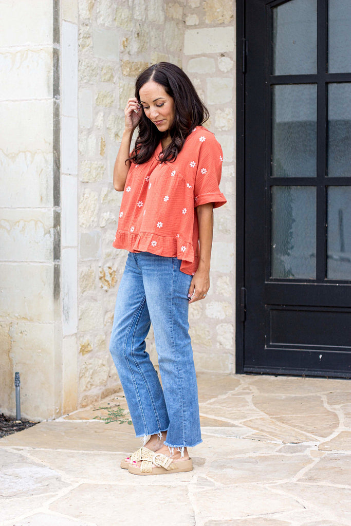 Our Rory Top is a darling embroidered v neck top with exquisite detailing and a flowy fit. We love this top worn over shorts or tucked into jeans!